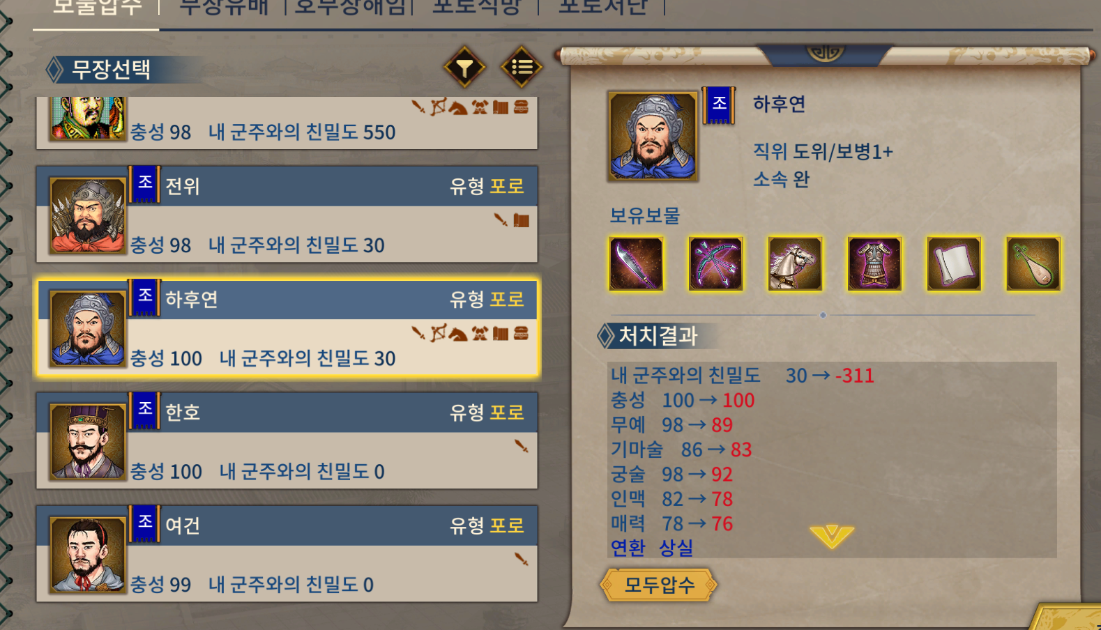 포로로 잡힌 사람들 중에 유간과 종예는 우리 편이므로 회유하여 등용하면 되고! 나머지는 석방!