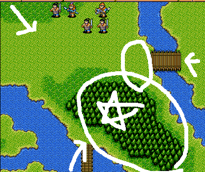 유벽이 다리를 못건너도록 길을 막으면서 다리와 숲 방향으로 군대를 배치한다.